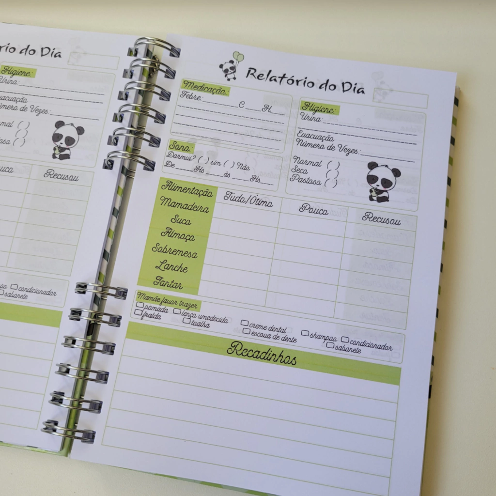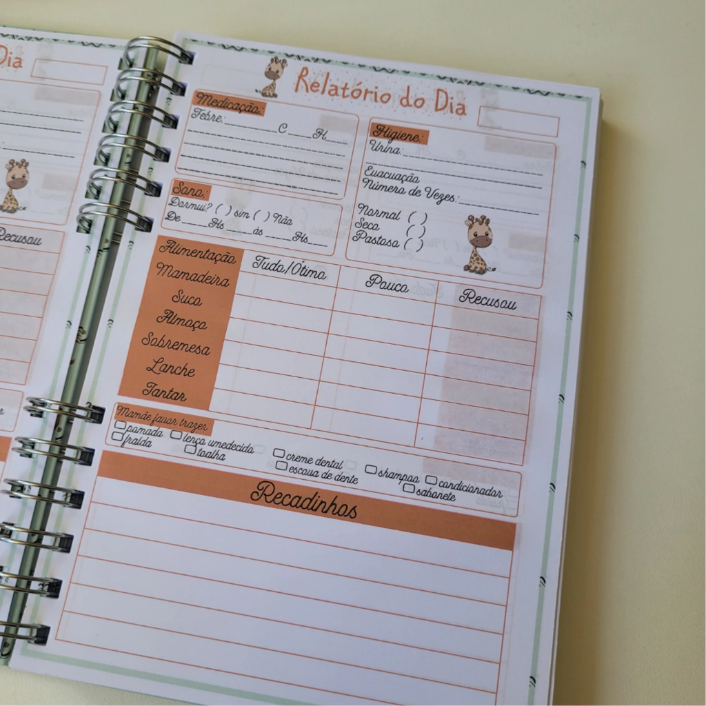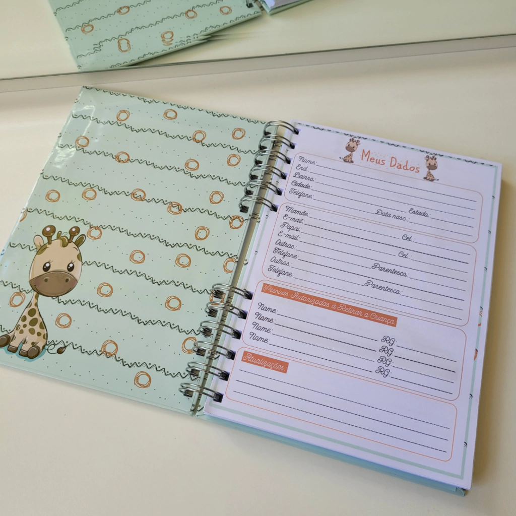 Nossa agenda foi pensada para facilitar a vida de pais e cuidadores, ajudando a criar uma ponte de comunicação eficaz e carinhosa. Com espaço para registrar todas as informações do dia a dia da criança, você acompanha o crescimento e desenvolvimento dela de perto, mesmo quando não está presente.