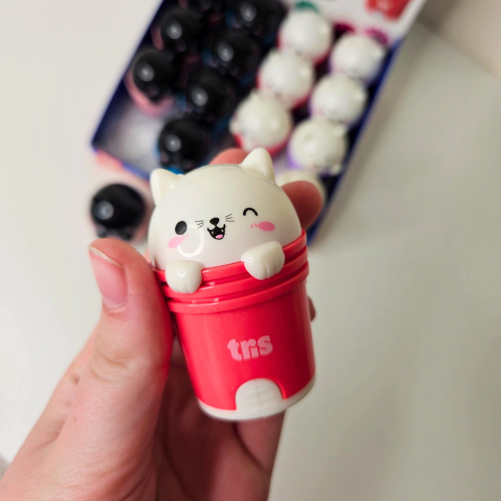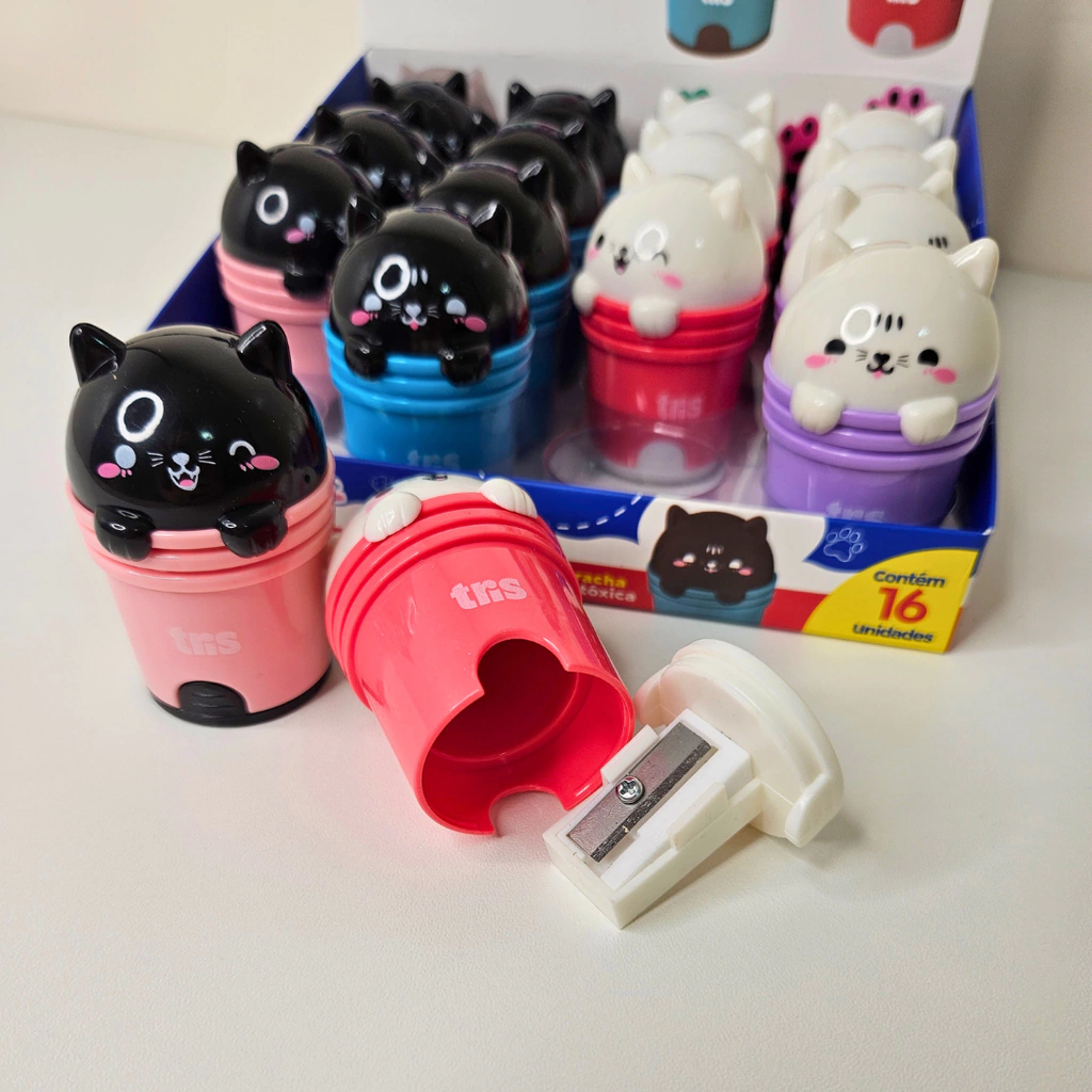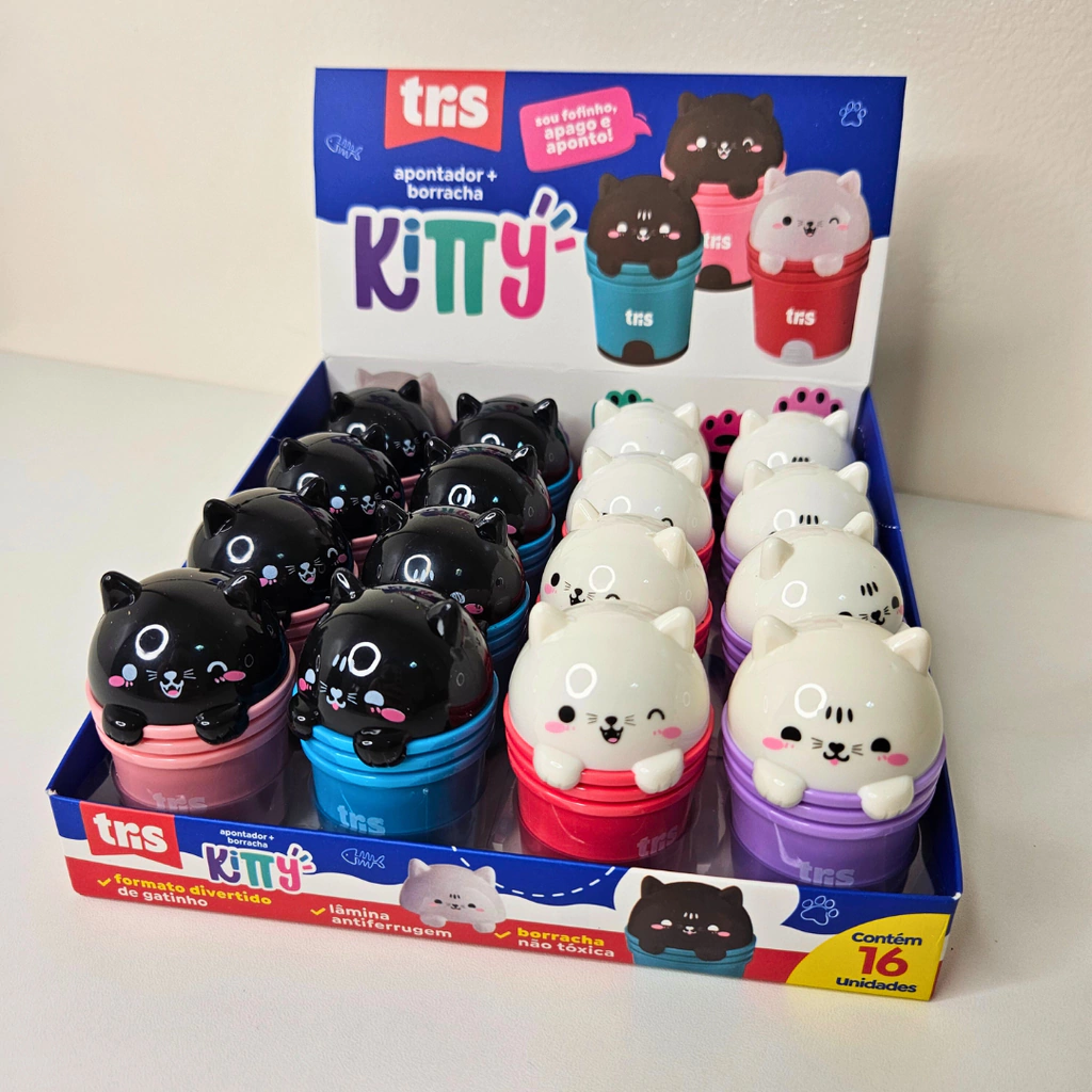 É muita fofura! O apontador + borracha Kitty é 2 em 1, que garante praticidade e possui formatos fofos de gatinhos. Sua borracha é não tóxica e o apontador tem lâmina antiferrugem.